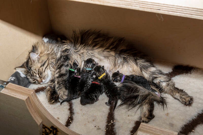 Le 1er mai 2023 aux aurores, Heaven a donné naissance à 7 adorables petits félins: 6 p'tits mecs, dont un a malheureusement rejoint les étoiles, et une seule petite nana. Les 6 chatons se portent bien, et nous nous émerveillons de l'instinct maternel d'Heaven.