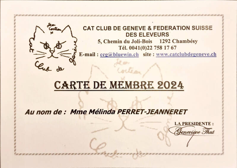 Nous sommes désormais affiliés au Cat Club de Genève. Ce dernier a été fondé en 1933 et fut le premier club suisse et le 3e club en Europe. Nous remercions sa présidente, Geneviève Thut, pour sa gentillesse et sa réactivité à répondre à nos nombreuses questions, et nous nous réjouissons de nos prochaines expositions sous leurs couleurs.